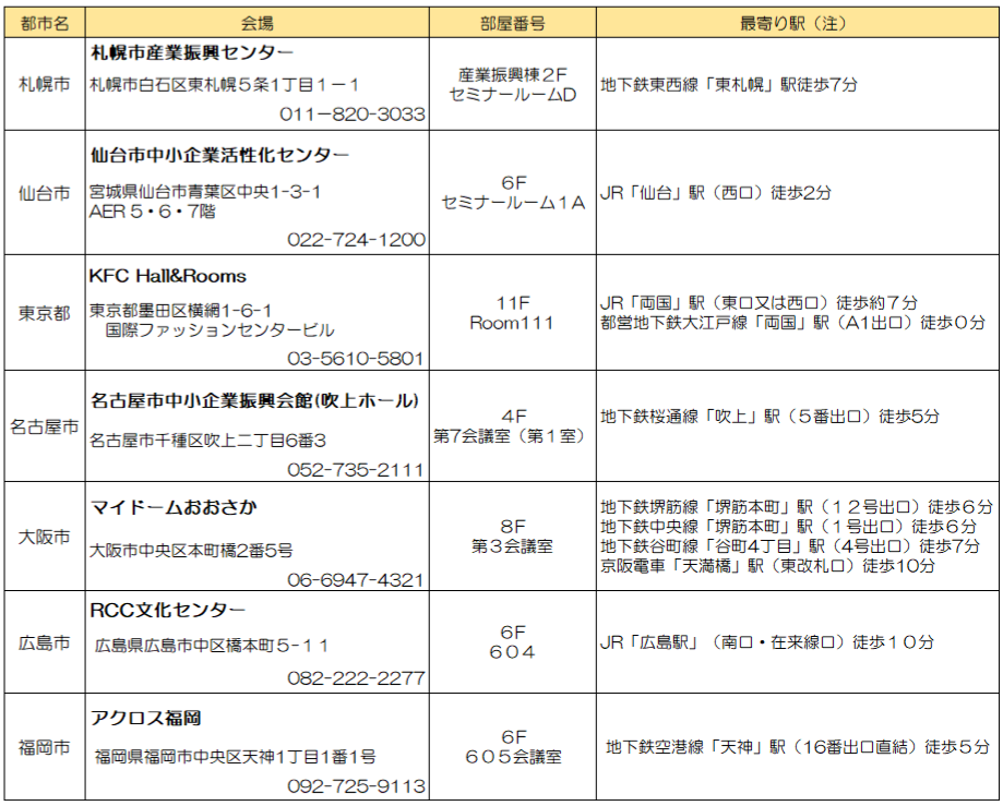 | 都市名 | 会場 | 部屋番号 | URL |
